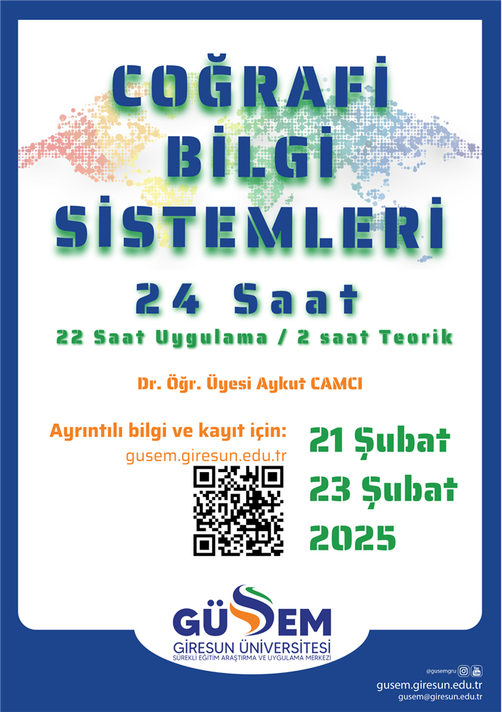 Giresun Üniversitesi GÜSEM tarafından düzenlenen “Coğrafi Bilgi Sistemleri” eğitimi, Dr. Öğr. Üyesi Aykut CAMCI yürütücülüğünde katılımcılarla buluşuyor.
